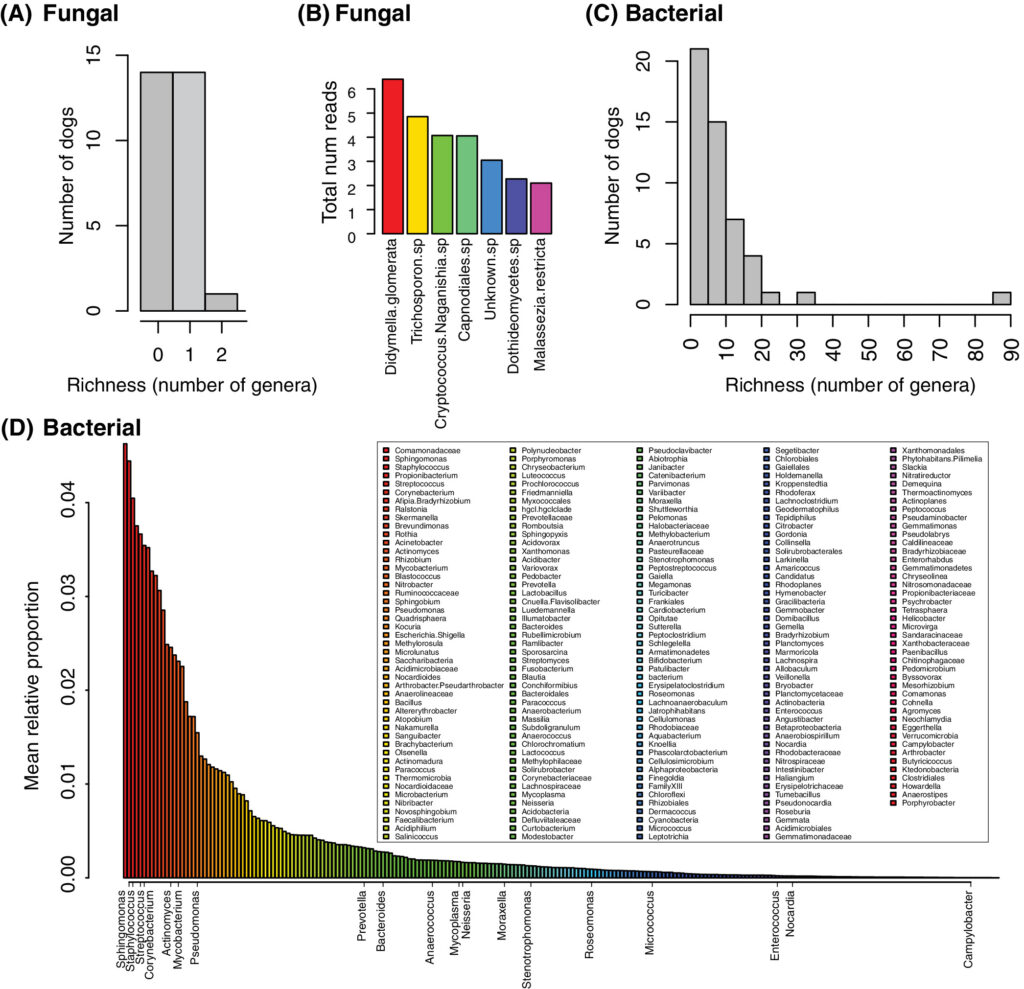 A avaliação genética da urina de todos os cães detectou um total de 231 gêneros de bactérias e 11 tipos de fungos.